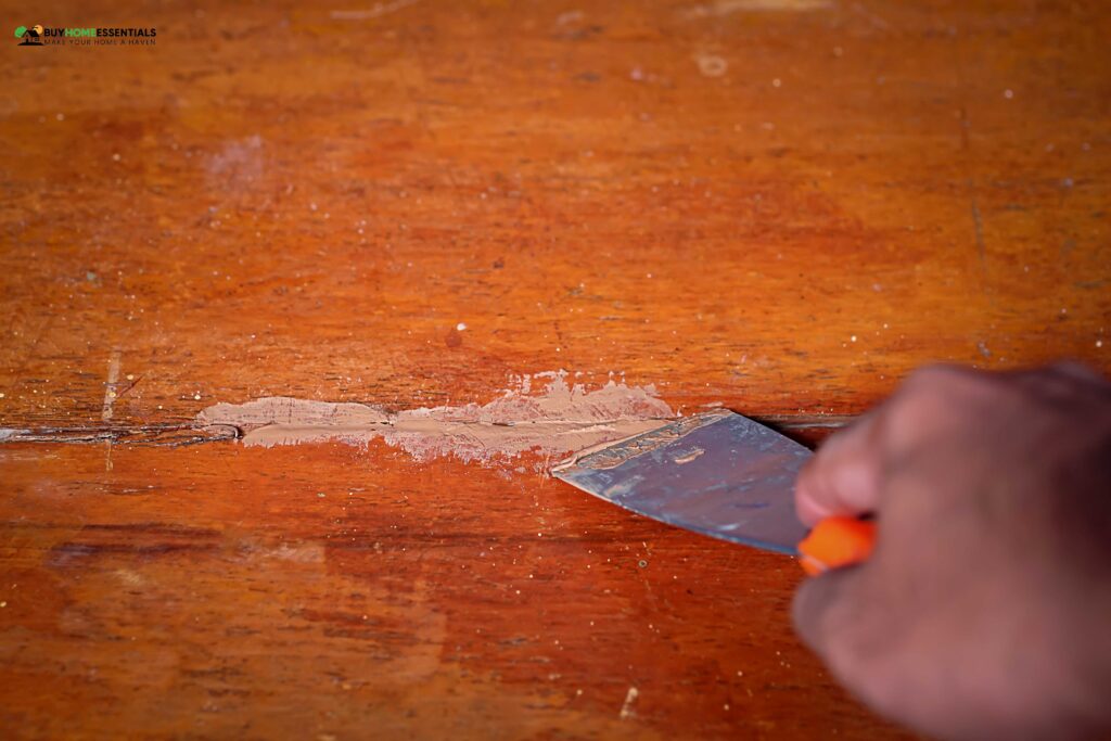 - Take a putty knife and scoop some wood filler onto it. Gently press the filler into the damaged areas, filling in the imperfections.