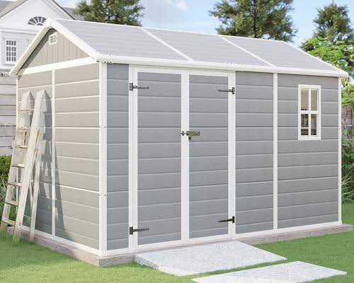 Specification: 10.5×7.6×7.5 ft Outdoor Resin Storage Shed with Floor, Windows & Air Vents, Large Waterproof Tool Shed for Garden, Backyard, Lawn Equipments & Bikes, Grey