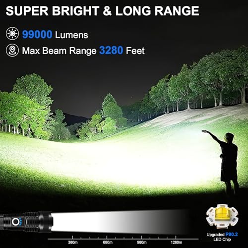 【Flashlights High Lumens】Rechargeable flashlight updated P90.2 Chip can generate up to 99000 lumens light output. High powered flashlights illuminate over 3280 ft through deep darkness, fog. ΒATTERY life of up to 1,000,000+ hours, perfect for home, dog walking, hiking, camping, and outdoor adventures
